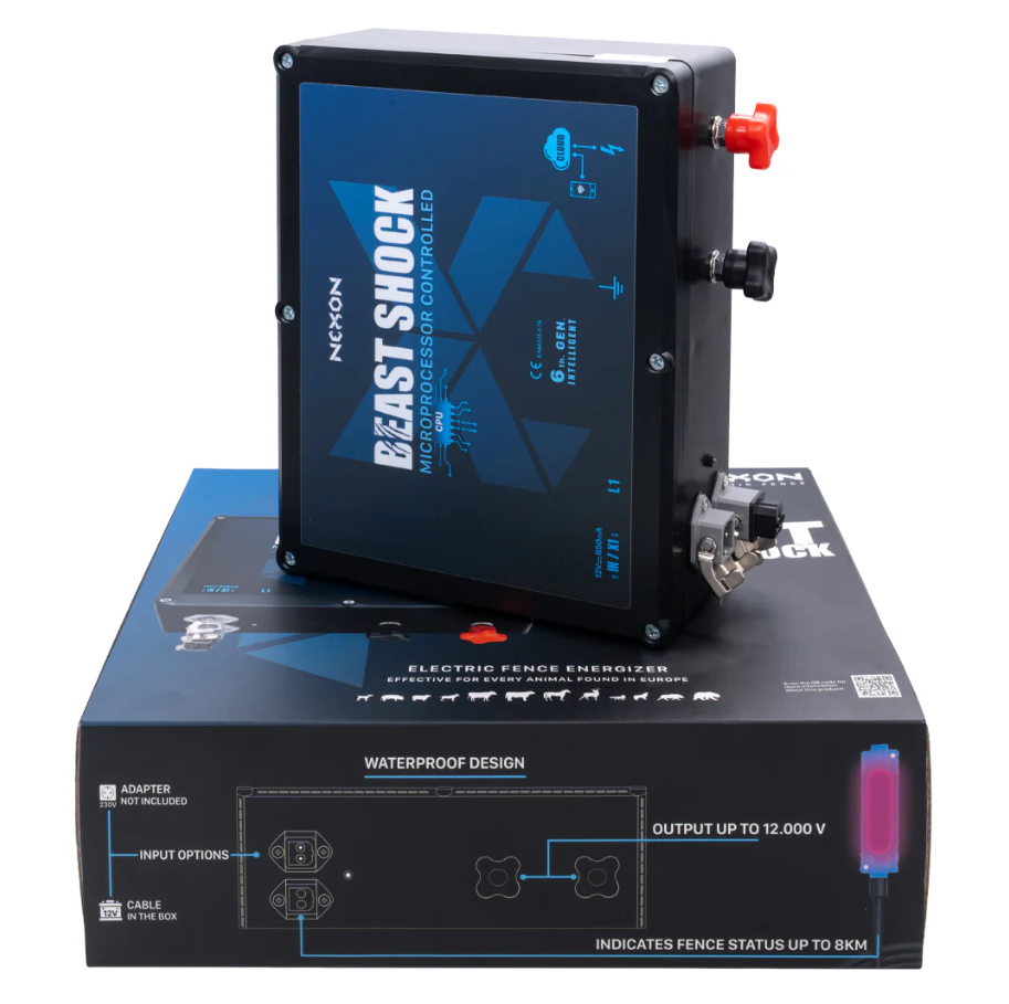 NEXON BeastShock 6th.GEN egy 10J teljesítményű impulzusgenerátor, amelyet ipari villanypásztor rendszerekhez terveztek. Megbízható védelmet nyújt farmokon, legelőkön, mezőgazdasági területeken és természetvédelmi területeken. A készülék 230V hálózatról vagy napelemmel és akkumulátorral működő rendszerről is üzemeltethető, így rendkívül sokoldalú és bármilyen körülményekhez igazítható.