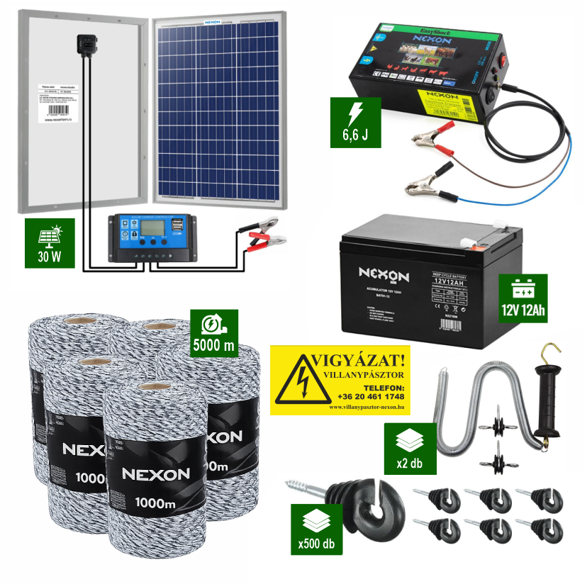 NEXON EasyShock 6,6J villanypásztor szett – 5000 m vezetékkel, napelemmel és akkumulátorral